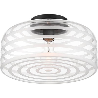 Possini Euro Design Cooper 12 3/4" Mid Century Modern Semi Flush-Mount Ceiling Light Fixture Kitchen Foyer Hallway Drum Black Finish Ribbed Glass