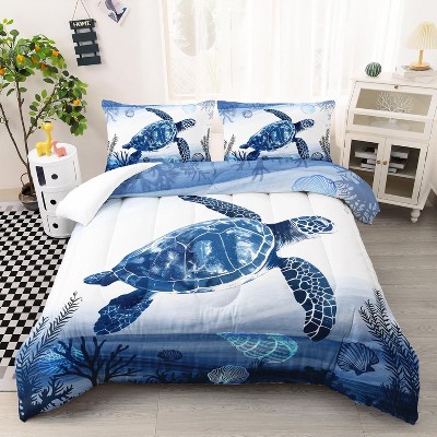 Turtle Bedding Set for Kids Girls Boys, Ocean Theme Ink and Wash Style Blue Comforter Set with 2 Pillowcases, Bedroom Decor 3 Pieces