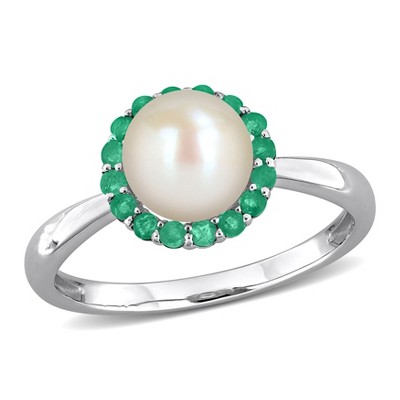 Ross-Simons 5mm Cultured Pearl and .30 Carat Emerald Toi Et Moi Ring in 14kt Yellow Gold