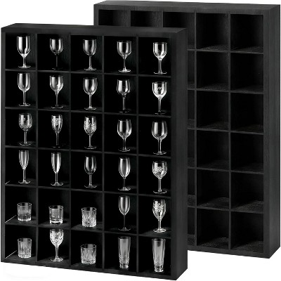 2 Pack Shot Glass Display Case - Black Wooden Wall Mounted Shadow Box Cabinet - 30 Slots, Removable Adjustable Shelves for Miniatures, Thimbles