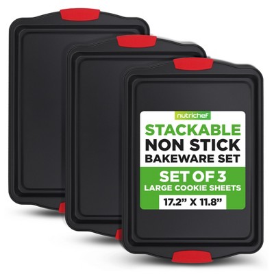 NutriChef 3-Piece Large Non-Stick Cookie Sheet Tray Set with Silicone Handles, Baking Pan for Oven, Black