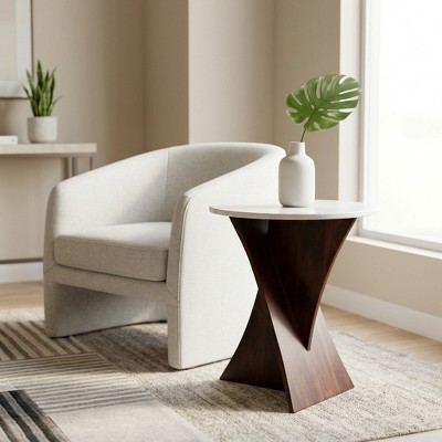 End Table, Side Table, or Small Night Stand - Polished Marble Top with Criss Cross Base for Modern Bedroom or Living Room Decor - 21" White & Brown