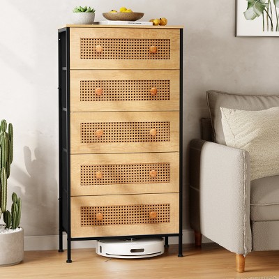 Crestlive Products 5 Drawers Rattan dressers for bedroom Storage Tower Tall Fabric Dresser with Wood Top &Wood Handles