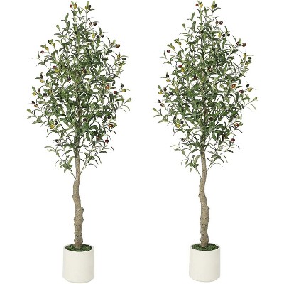 Artificial Olive Tree 5FT Tall Faux Olive Tree Indoor Fake Silk Plant with Realistic Trunk, Leaves, Fruits and White Planter, 2 Pack