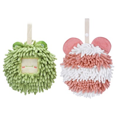 REGALWOVEN 2 Packs Chenille Fuzzy Cute Bear Shape Decorative Soft Absorbent Hanging Ball Hand Towels 7" x 7"