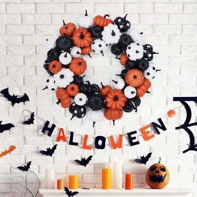 18 Inch Halloween Pumpkin Wreath - Orange Black White Pumpkin Decor with Rattan Base, Fall Front Door Wreath for Indoor Outdoor Home Party