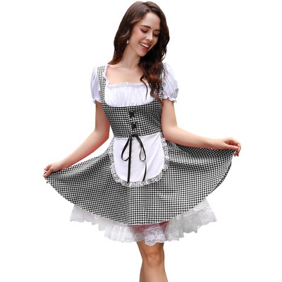 Women's Traditional Cultural Dress Checkered Lace Design Square Neck Puff Sleeve Pullover Outfit
