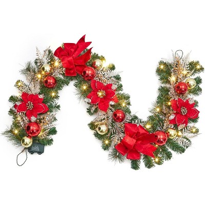 6 Ft Pre-Lit Christmas Garland, Xmas Garland with Flowers, Ball Ornaments Berry for Mantle Table Centerpiece Indoor Outdoor Home Decor