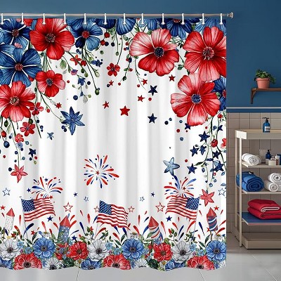 Lomsoe 4th of July Floral Shower Curtain Red Blue Flowers Patriotic Independence Memorial Shower Curtains Bath Curtains Sets with Hooks 70.8x70.8Inch