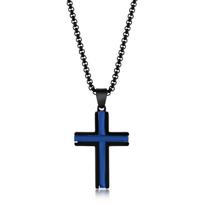 Metallo Mens Stainless Steel Black & Blue Plated Cross Necklace - Black - 24 Inch