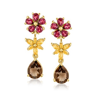 Ross-Simons 2.80 ct. t.w. Smoky Quartz and 2.00 ct. t.w. Rhodolite Garnet Flower Drop Earrings With .60 ct. t.w. Citrines in 18kt Gold Over Sterling