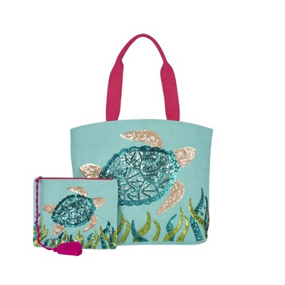 Mina Victory Handbag Sequin Sea Turtle 22" x 15" x 6" Beach Bag with Matching Clutch Turquoise