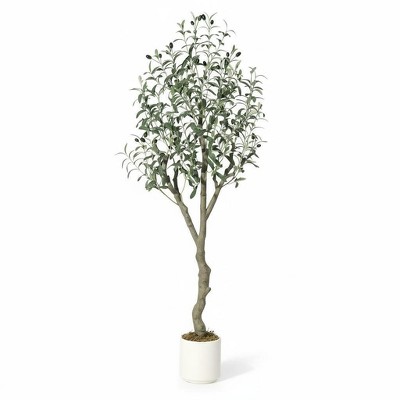Realistic Artificial Olive Tree Single Stem Faux Plant with Fruit Accents Natural Looking Trunk in Decorative Planter for Living Room Office