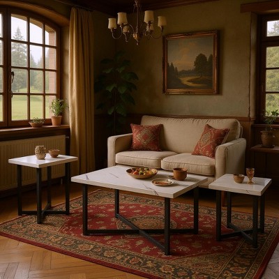 3-Pc Modern Coffee and End Table Set with Faux Marble Tops and Angular Bases, Luxurious Accent for Living Room or Lounge