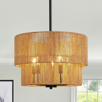 Boho 18" Rattan Double Drum Chandelier Light Fixture 5-Light Dimmable Natural Woven Pendant for Kitchen Island, Dining Room & Bedroom