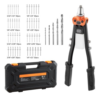 VEVOR Pop Rivet Gun Kit, with 230 Blind Rivets, Two-Handed Riveter with 5 Interchangeable Nosepieces, 5 Drill Bits, and a Carrying Case, Black