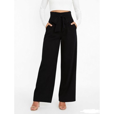 Womens High Waist Paperbag Pant Wide Straight Leg Tie Front Knot Business Casual Pants with Pockets