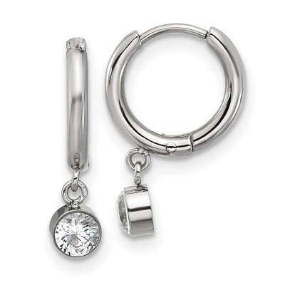 Chisel Stainless Steel Polished White Zircon Dangle Hinged Hoop Earrings