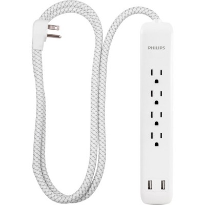 Philips 4-Outlet Surge / 2 USB-A 720 Joules 4' Braided Cord - White: Extension Cord.