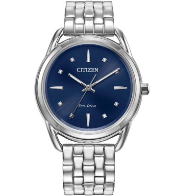 Citizen Ladies Eco-Drive Dress Classic Crystal Watch, Silver-Tone Stainless Steel Bracelet, Blue Dial, 3 Hand, Date