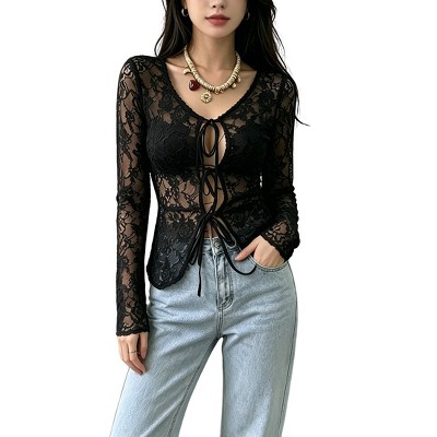 Women's Lace-Up Sheer Lace Cardigan Long Sleeve Hollow Floral Mesh Slim Fit Semi-Sheer Bodycon Casual Shirt