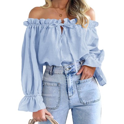 Imily Bela Womens Off The Shoulder Tops Puff Long Sleeve Tie Front Loose Fit Ruffle Shirts Blouses