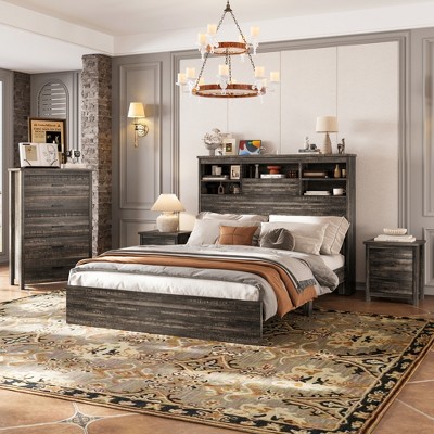 TIRAMISUBEST 4PCS Bedroom Sets, Wooden Queen Size Bed Frame with Storage Headboard, 2 Nightstands with 2 Drawers, 1 Dresser with 5 Drawers