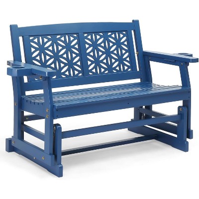 VINGLI Fir Wood Outdoor Glider with Floral Backrest, Wooden Patio Gliding Bench with Cup Holders, Smooth Rocking Chair