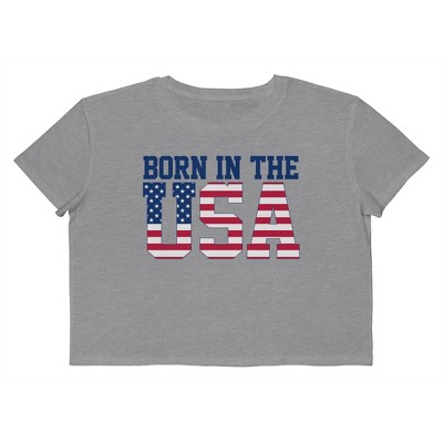 Rerun Island Women's Born In The Usa Flag Logo Black Americana 4Th Of July Short Sleeve Graphic Cotton Cropped Loose T-shirt - Athletic Heather L