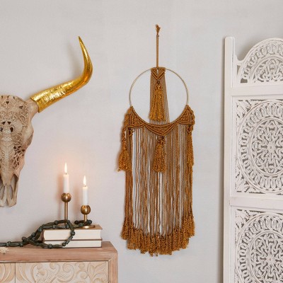 Fabric Macrame Intricately Weaved Wall Decor with Beaded Fringe Tassels Brown - Olivia & May: Bohemian Vertical Carved Art, Spot Clean