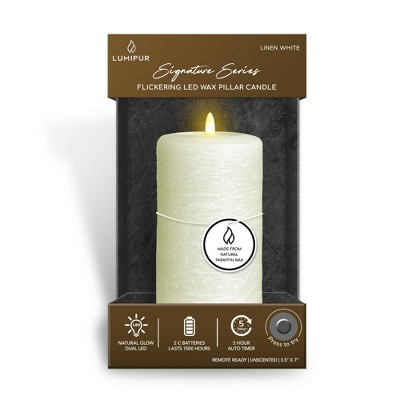 LumiPur 3.5"x7" Signature Natural Glow Flickering Flameless LED Wax Pillar Candle Linen White