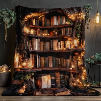 Lomsoe 1pc Flannel Blanket Featuring a Bookshelf Design Suitable for Travel, Camping, Sofa, Living Room, Couch, Chair, Or Bed.
