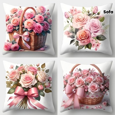 Lomsoe 4pcs Pink White Rose Bouquet Soft Cushion Cover For Sofa Bedroom Living Room Home Decor 18x18in.