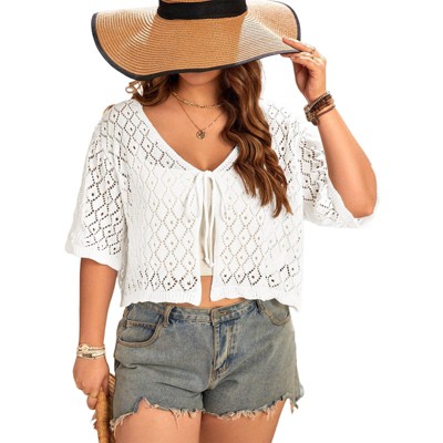 Women's Plus Size Crochet Cardigan Crop Short Sleeves Tie Front Lightweight Knitwear