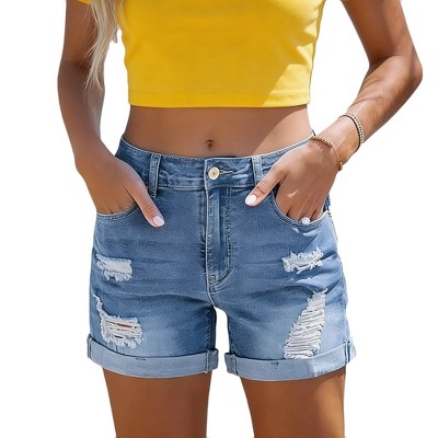 Plus Size High Waist Denim Shorts - Rolled Hem Distressed Jean Shorts