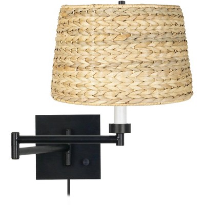 Franklin Iron Works Modern Swing Arm Wall Lamp Espresso Plug-In Light Fixture Woven Seagrass Drum Shade for Bedroom Living Room