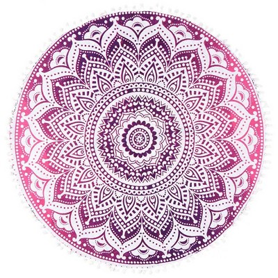 HomeRoots 32" Pink and White Round Geometric Floor Pillow Cover With Pompoms