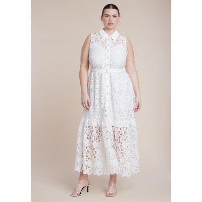 Knit & Lounge Women’s Embroidered Eyelet Shirt Dress Removable Waist Tie Short Sleeves Button Front Midi Scallop Hem