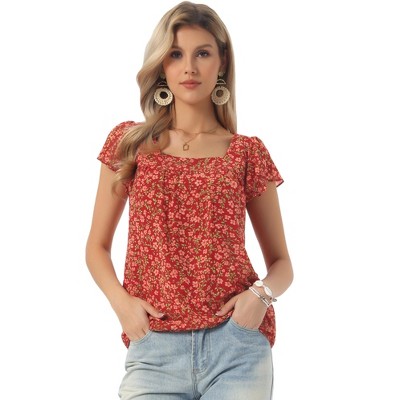 Allegra K Women's Floral Turndown Collar Split Neck Short Sleeve Elegant Vintage Tops