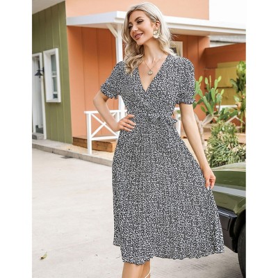 Clearlove Women's Floral Pleated Dress Short Sleeve Wrap V Neck A-Line Pleated Hem Midi Dresses with Belt