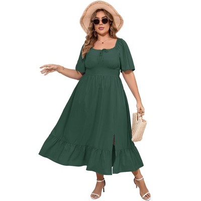 Womens Plus Size Square Neck Floral Print Ruffle Short Sleeve Tie Front Slit Hem Boho Dress