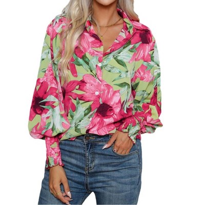 Clearlove Women's Color-Block Floral Print Shirt with Lantern Sleeves and Collar