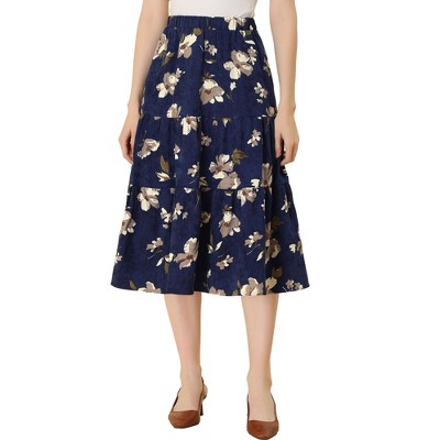 INSPIRE CHIC Women's Corduroy Elastic Waist Warm Fall A-Line Pockets Tiered Floral Midi Skirt