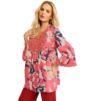 Roaman's Plus Size Juliet Lace Trim Button-Down Shirt 40 W, Sunset Coral Hibiscus Floral