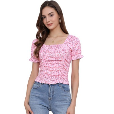 Allegra K Women's Casual Tie Neck Short Sleeve Ruffled Floral Tops