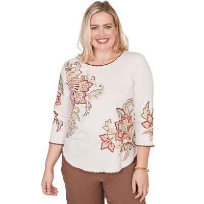 Alfred Dunner Womens Asymmetrical Scroll Floral Round Hem Top, Oatmeal, Size L