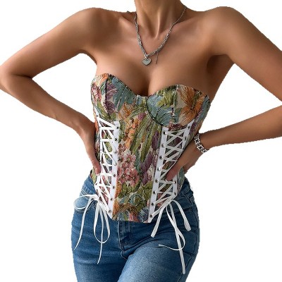 Womens Floral Ruffle Corset Back Tie Sleeveless Bustier Top