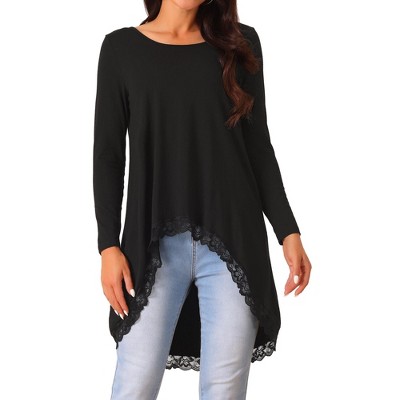 Seta T Women's High Low Tops Long Sleeve Lace Trim Crewneck Irregular Hem Flowy Blouse Tops