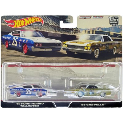 1969 Ford Torino Talladega #25 White & Blue w/Red & 1966 Chevrolet Chevelle #86 Gold w/White Diecast Model Cars by Hot Wheels