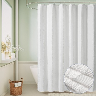 No Hook Shower Curtain and Liner Set Tufted Striped Textured Waterproof White Boho Style with See Through Top